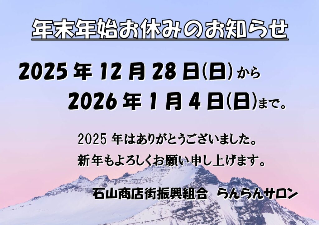 本年も大変お世話になりました。12月28日~新年1月4日まで、石山商店街振興組合事務所(らんらんサロン)はお休みさせていただきます。