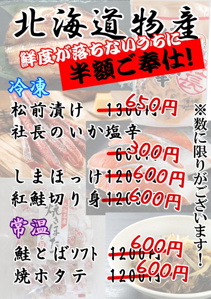 news 北海道物産半額セール決定 2025,12,22 12月14日、あまりお天気が良くなかったのが客足に響き、手に取っていただけなかった北海道のお魚を、美味しいうちに残り数量に限り半額にてご奉仕いたします。是非お立ち寄り下さいませ。 新着記事 2026,02.02 鮭とばあります2026,01.17 2月21日の「九雀亭」のチケットを販売中2026,01.14 「すみれカード」のお問い合わせは2025,12.27 年が明けてからクリックしてください2025,12.24 遅くなりましたが全国大会出場中学生の表彰の模様です2025,12.22 北海道物産半額セール決定2025,12.22 年末年始のお休みのお知らせなど2025,12.17 エプロン探検で来てくれた小3のみんなより2025,12.15 12月14日のとれ取れ祭りは終了いたしました2025,12.13 明日はとれ取れ祭りです記事一覧へ戻る
