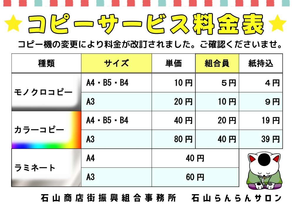 これまであったコピー機と輪転機から、新しいコピー機一台になりました。それに伴いコピー代も変更になりましたので、ご確認ください。ちょっと上がってしまって申し訳ありません。